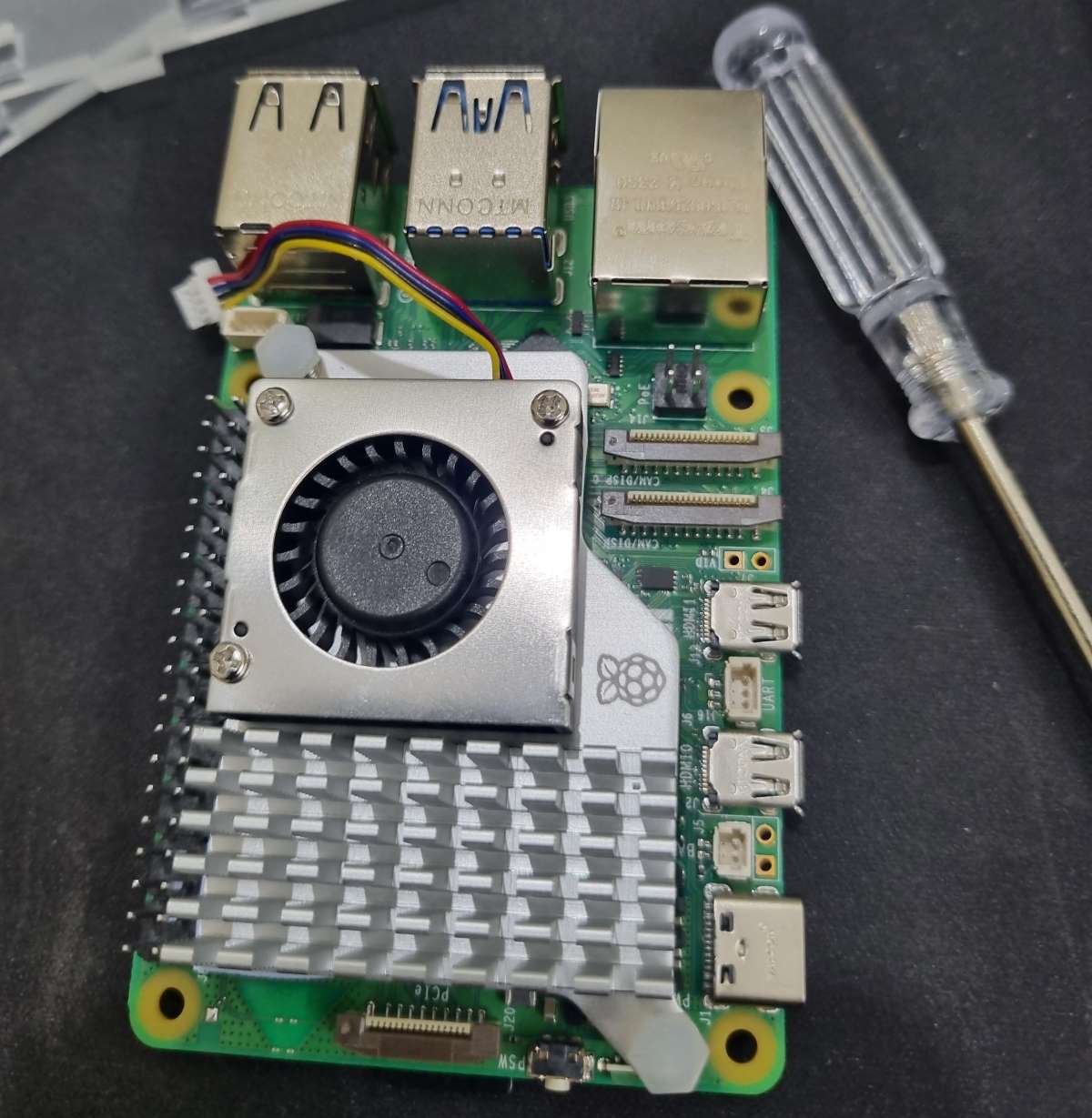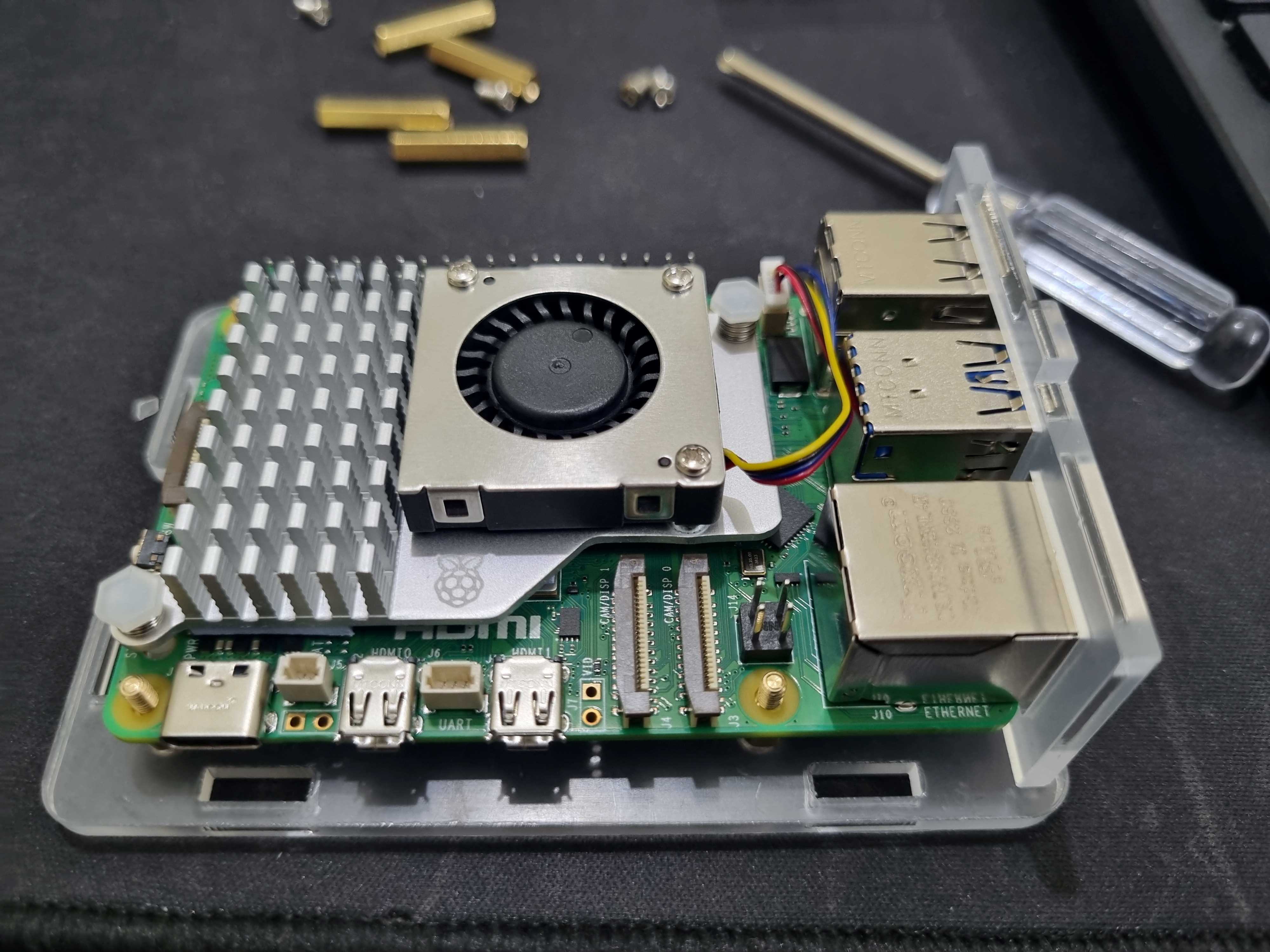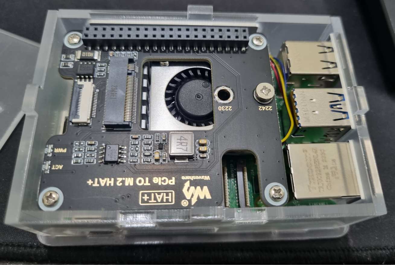 | Install the PCIe To M.2 HAT with the preferred SSD (refer to official tutorial) | Close the shell and ensure that the standoff stacks with M.2 adapter well and its sturdy |